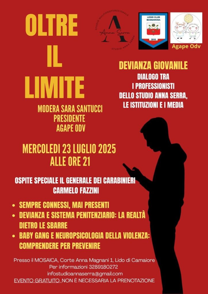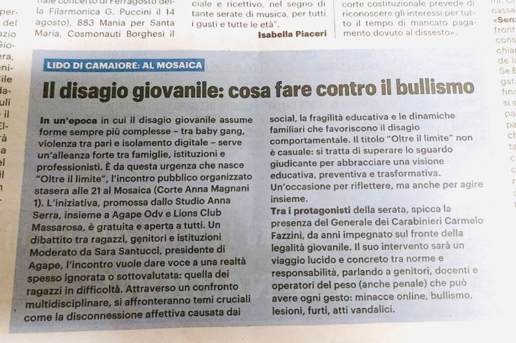 Oltre il limite…Sensibilizzare e promuovere strategie concrete di prevenzione, temi delicati, temi sempre più presenti nella vita di tutti noi.Sempre connessi, mai presenti, riflessioni sul digitale e isolamento sociale. Devianza e sistema penitenziario. Neuropsicologia della violenza e baby gang, l’importanza di comprendere per prevenire.Bullismo e Cyberbullismo, aspetti penali e molto altro… Grazie allo Studio Multi Professionale Anna Serra per aver organizzato l’evento. Grazie alla partecipazione del compartimento teatro di Agape ODV che ha portato in scena un monologo iniziato ad apertura e terminato alla chiusura della serata, lasciando a bocca aperta il pubblico attraverso l’interpretazione di Anna (11 anni). Grazia alla presenza e partecipazione dei Lione Club Massarosa. Da sinistra Mediatrice della serata Sara Santucci presidente Agape ODVDott.ssa Elisa Matteucci, psicologa clinica dello sviluppo e psicoterapeuta in formazione ad indirizzo neuropsicologico. Dott.ssa Virginia Bruno, educatrice professionale, coordinatrice genitoriale e mediatrice familiare.Dott.ssa Anna Serra, logopedista e psicologa specializzata in giuridica. Dott.ssa Daiana Bonotti, psicologa psicoterapeuta e criminologa.Generale dei Carabinieri Carmelo Fazzini.Dott.ssa Daiana Bonotti, psicologa psicoterapeuta e criminologa.Dott.ssa Costanza Dorepsicologa,logopedista,psicodiagnostaStefania Fialdini, counsellor e life coach